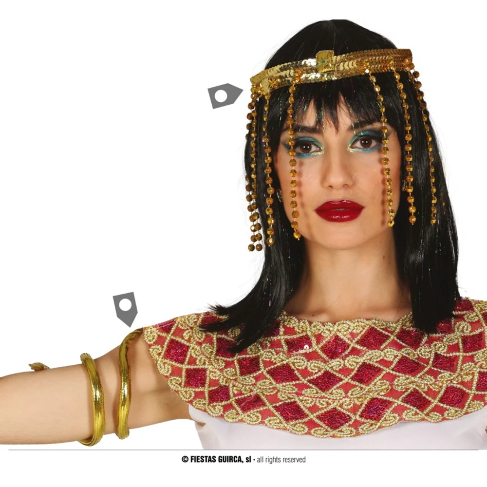 This simple Cleopatra headband set incudes a beautiful headpiece, armband to complete your Cleopatra look. The strands of beads on the headband dangle down to add that extra touch. The perfect fabulous accessory for any Egyptian.