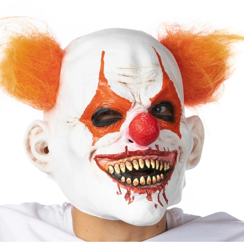 This over head latex mask is a clown character with attached hair, this is guaranteed to frighten everyone away and it will sure keep the attention on yourself! Ideal for Halloween events and Parties!
