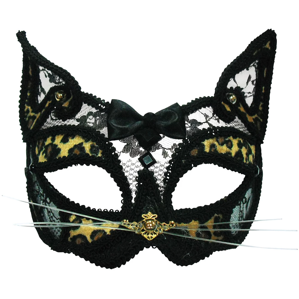 This leopard print cat mask is perfect for your masquerade ball or even your Halloween party! The beautifully detailed mask is attached to glasses to make it more comfortable when wearing.