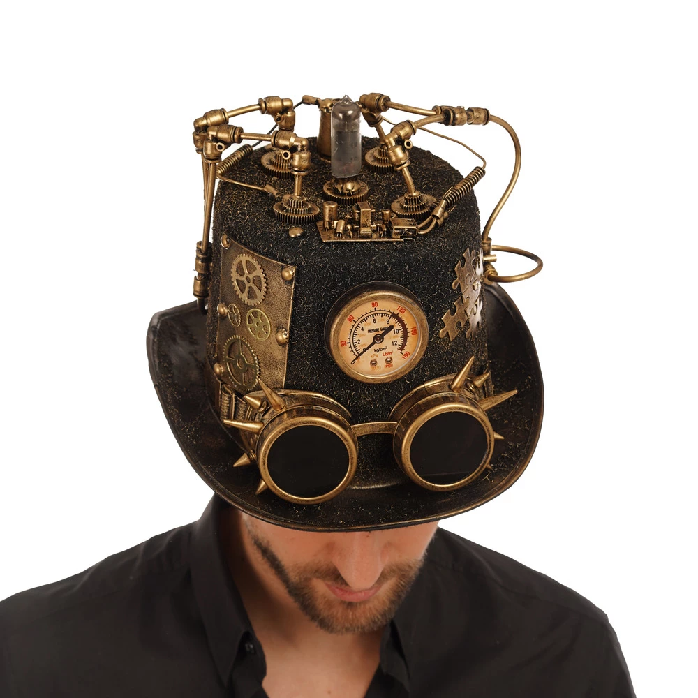 This beautiful detailed steampunk hat is a great addition to any Steampunk look or fancy dress costume. The detail of the cogs and the clock is an added affect to this steampunk hat, the goggles complete the hat making it unique and a feature to your fancy dress outfit. The inside of the hat has elastic so that the hat will every head allowing a snug fit without falling off during your night out.